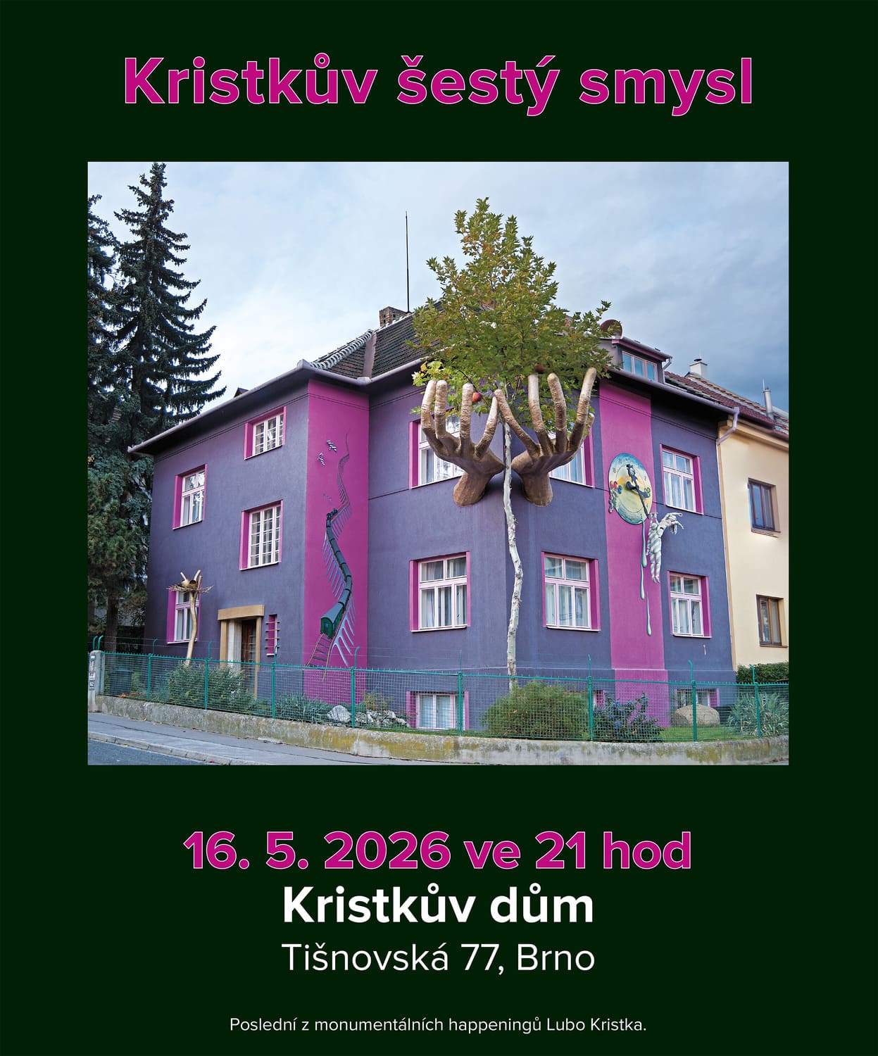 V sobotu 16. května 2026 ve 21 hodin ožije před Kristkovým domem v Brně a v něm „Kristkův šestý smysl aneb Prostor duše III“. Tento umělecký dotek navazuje na happeningy autora domu, sochaře, malíře a performera Lubo Kristka v německém Landsbergu v roce 1992 a v belgickém Hasseltu v roce 1998. Na jediný večer dům změní svou podobu i způsob, jakým přijímá návštěvníky.