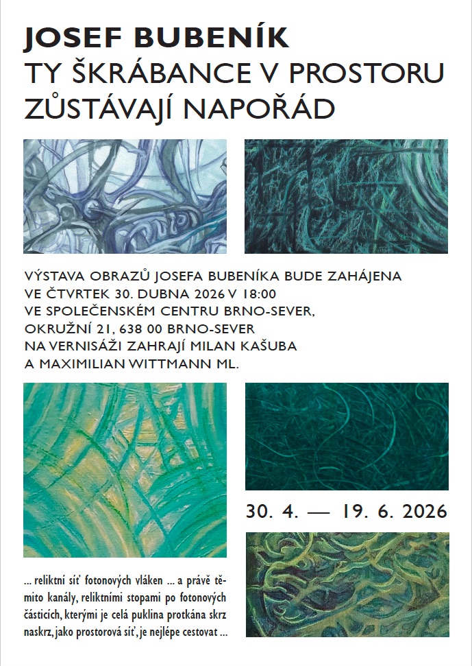 Výstava obrazů Josefa Bubeníka bude zahájena ve čtvrtek 30. dubna 2026 v 18:00 ve Společenském centru Brno-sever, Okružní 21, 638 00 Brno-sever.